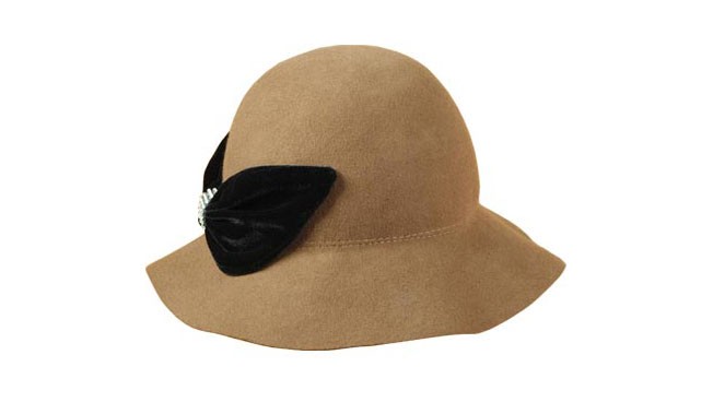 100%純羊毛的帽子,溫暖的駝色,簡約的造型,配以一只黑色大蝴蝶結,時尚而別致。漁夫帽,盆帽。